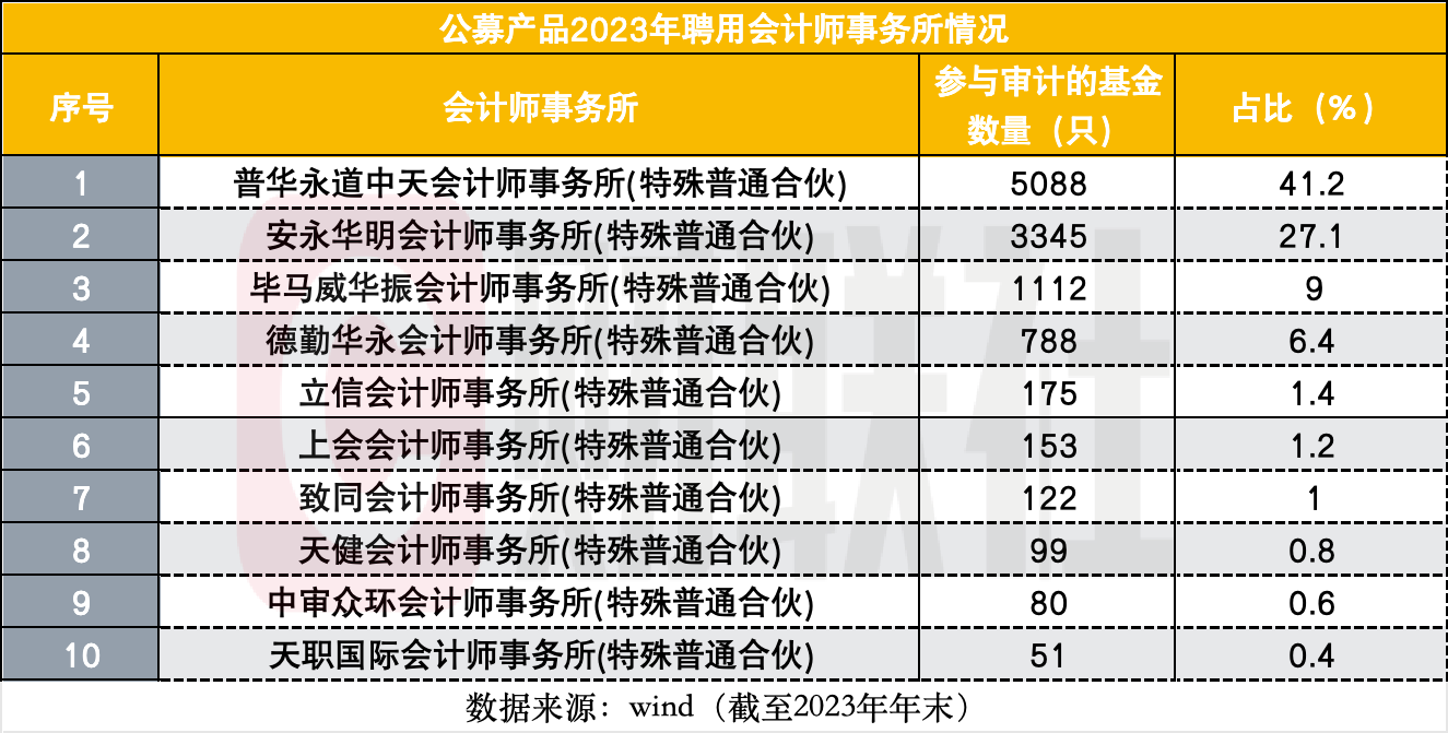 截至2024年年末,普华永道参与审计的基金产品仅147只,占比为1.2%。而截至2023年年末,普华永道参与审计的公募产品共5088只,市占率为41.2%,在公募审计领域排名居首。