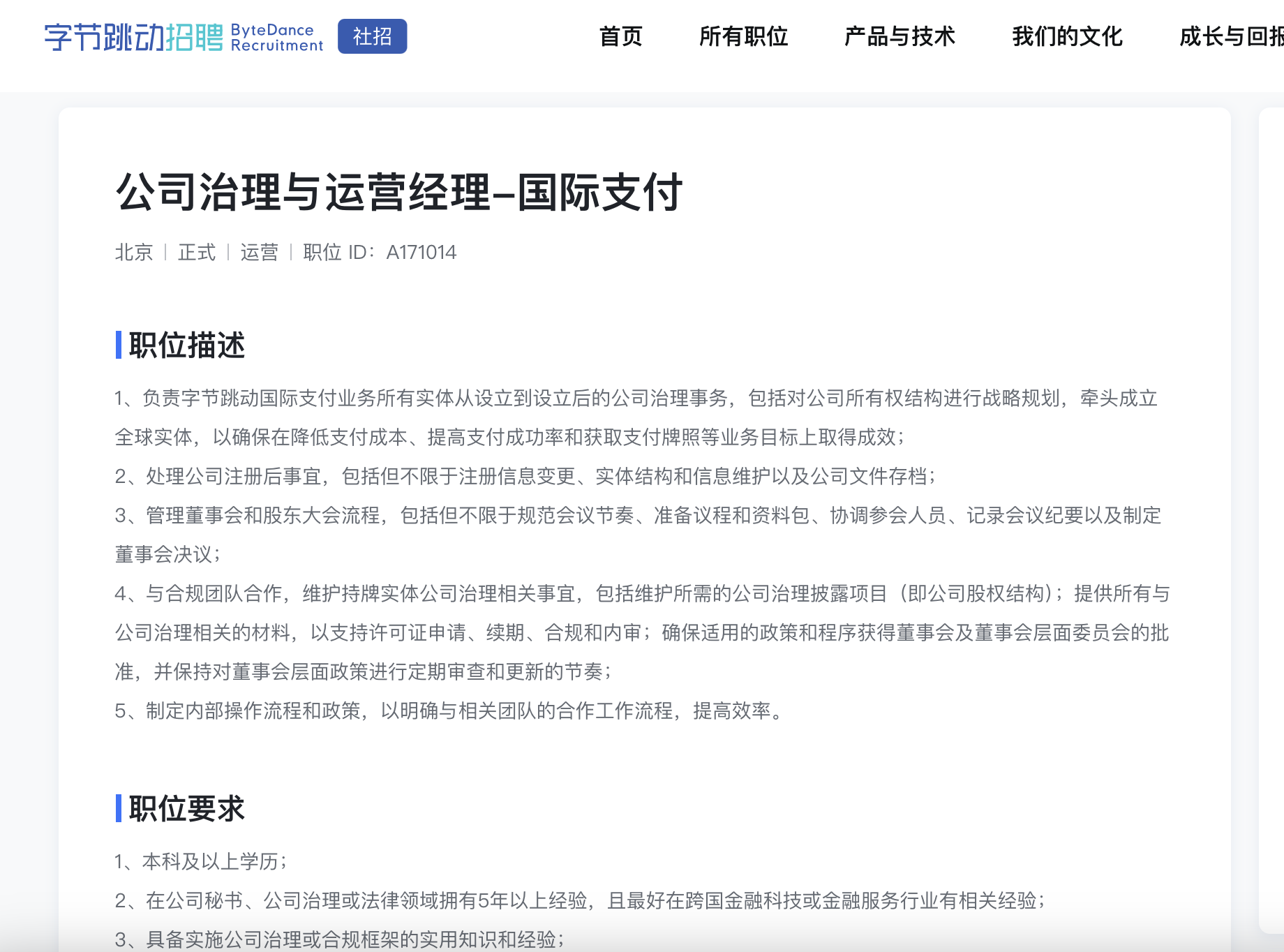 不过,《科创板日报》记者从知情人士获悉,字节跳动在国际支付领域的国际主体几年前就已设立完成,并且与集团其他业务主体保持独立运行。此次招聘的岗位主要是参与日常治理和主体管理的工作,并非新设公司或新任负责人。